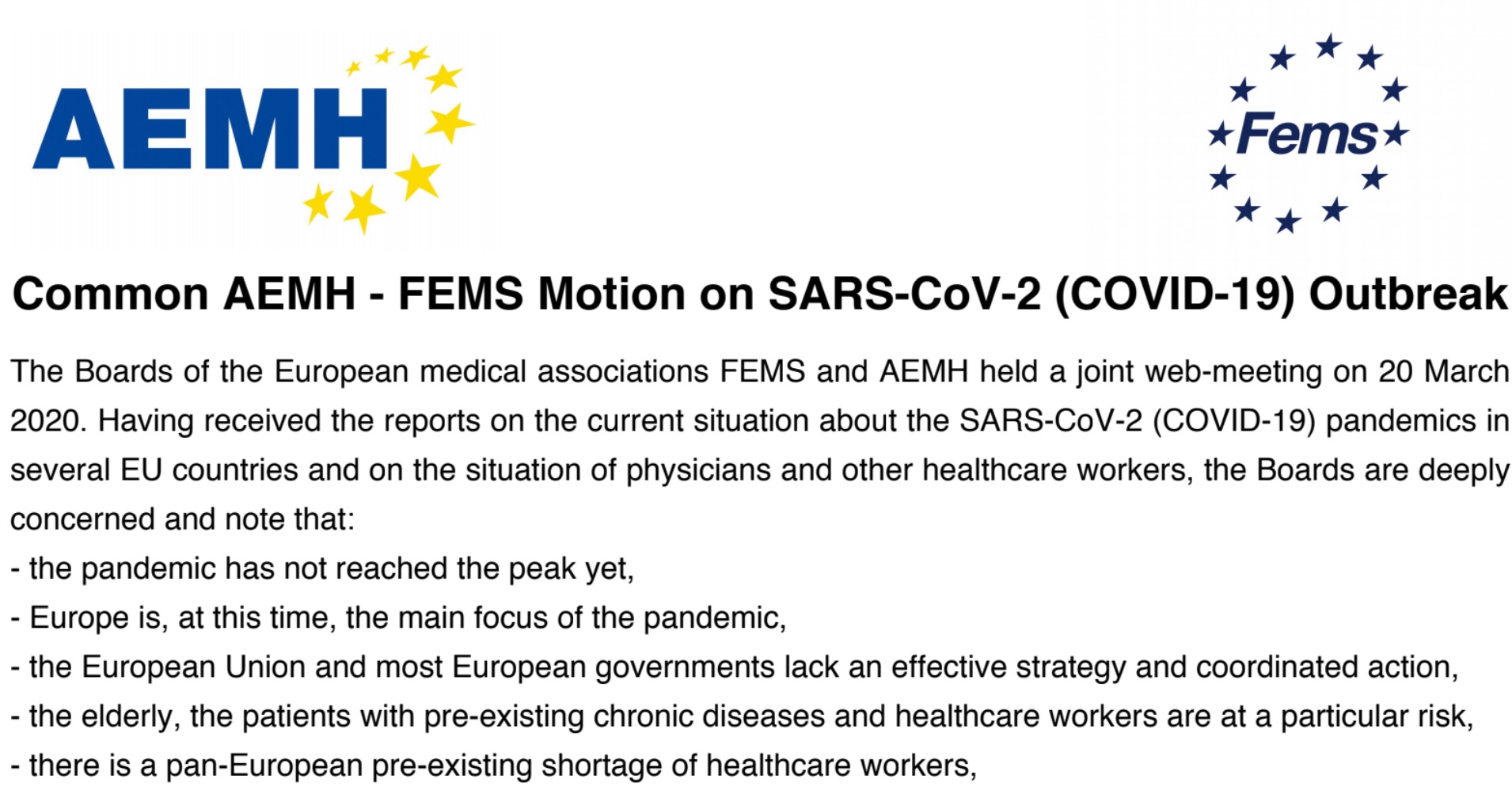 Los consejos de las asociaciones médicas europeas FEMS (de la que forma parte la Confederación Estatal de Sindicatos Médicos) y AEMH celebraron una reunión telemática conjunta el pasado 20 de marzo, tras la cual, han emitido un comunicado conjunto. Habiendo recibido los informes de la situación actual sobre las pandemias del SARS-CoV-2 (COVID-19) en varios países de la UE y respecto a la situación de los médicos y otros trabajadores de la salud, las Juntas están profundamente preocupadas y quieren que se tenga en cuenta los siguientes aspectos: