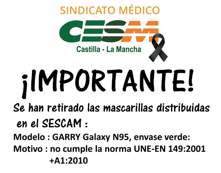 CESM pide que “riesgos laborales” revise el material de protección para los sanitarios que llega a los hospitales y a los centros de salud para que no ocurra lo que ha pasado con las mascarillas no homologadas que han tenido que ser retiradas o los EPIs de Ciudad Real de protección insuficiente, «algo lamentable», como recoge la Cadena COPE.