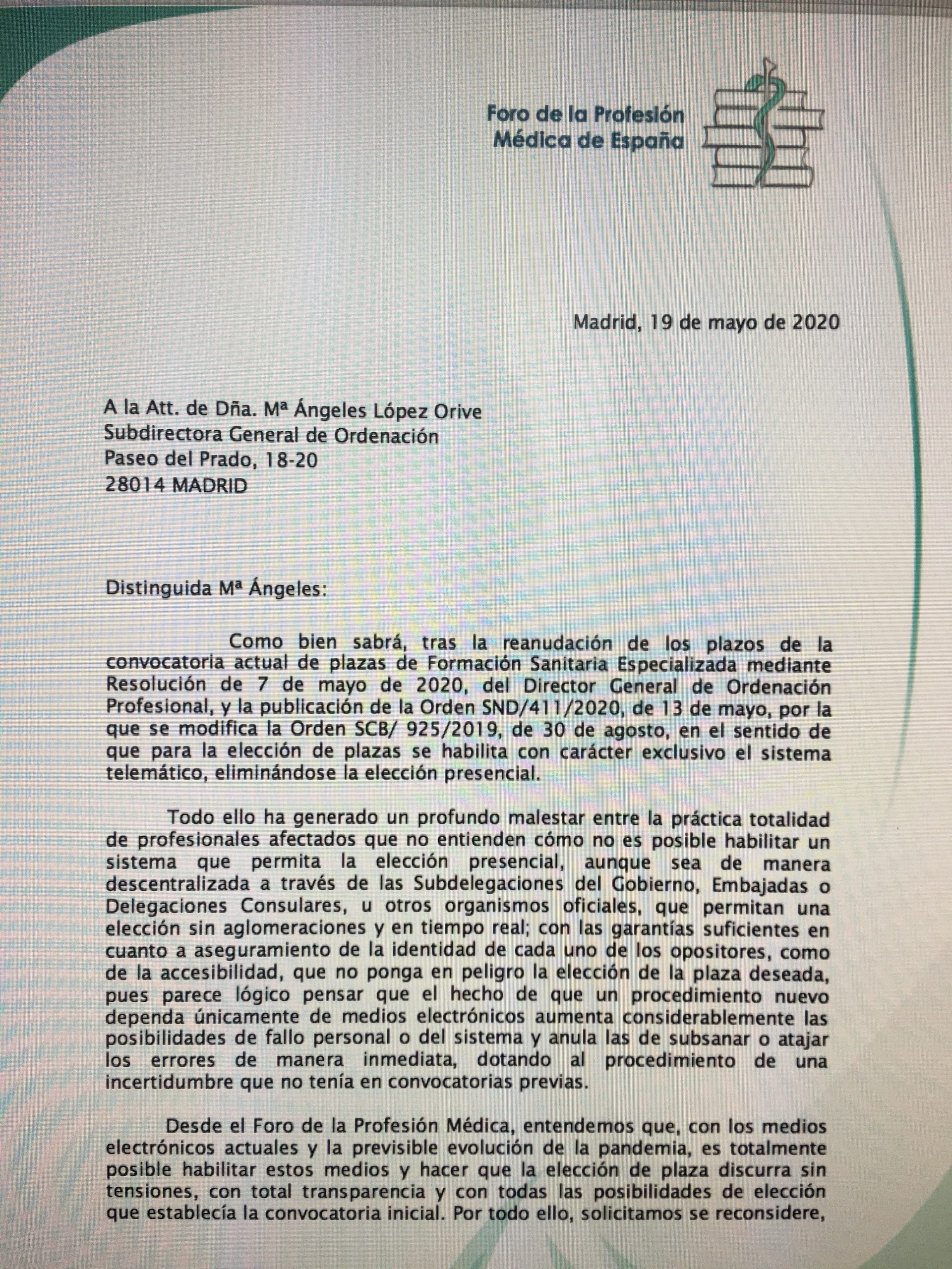 Como bien sabrá, tras la reanudación de los plazos de la convocatoria actual de plazas de Formación Sanitaria Especializada mediante Resolución de 7 de mayo de 2020, del Director General de Ordenación Profesional, y la publicación de la Orden SND/411/2020, de 13 de mayo, por la que se modifica la Orden SCB/ 925/2019, de 30 de agosto, en el sentido de que para la elección de plazas se habilita con carácter exclusivo el sistema telemático, eliminándose la elección presencial.