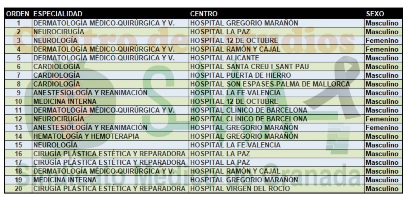 Entre los 100 primeros electores son mayoría los hombres con el 61%. Dermatología es la especialidad más demandada (23 Plazas), seguida de Cardiología (20 plazas), Medicina Interna (10 plazas), Anestesiología (8 plazas), Cirugía Plástica (8 plazas), Pediatría (5 plazas), Cirugía General (4 plazas), Neurocirugía (4 plazas), Neurología (4 plazas).