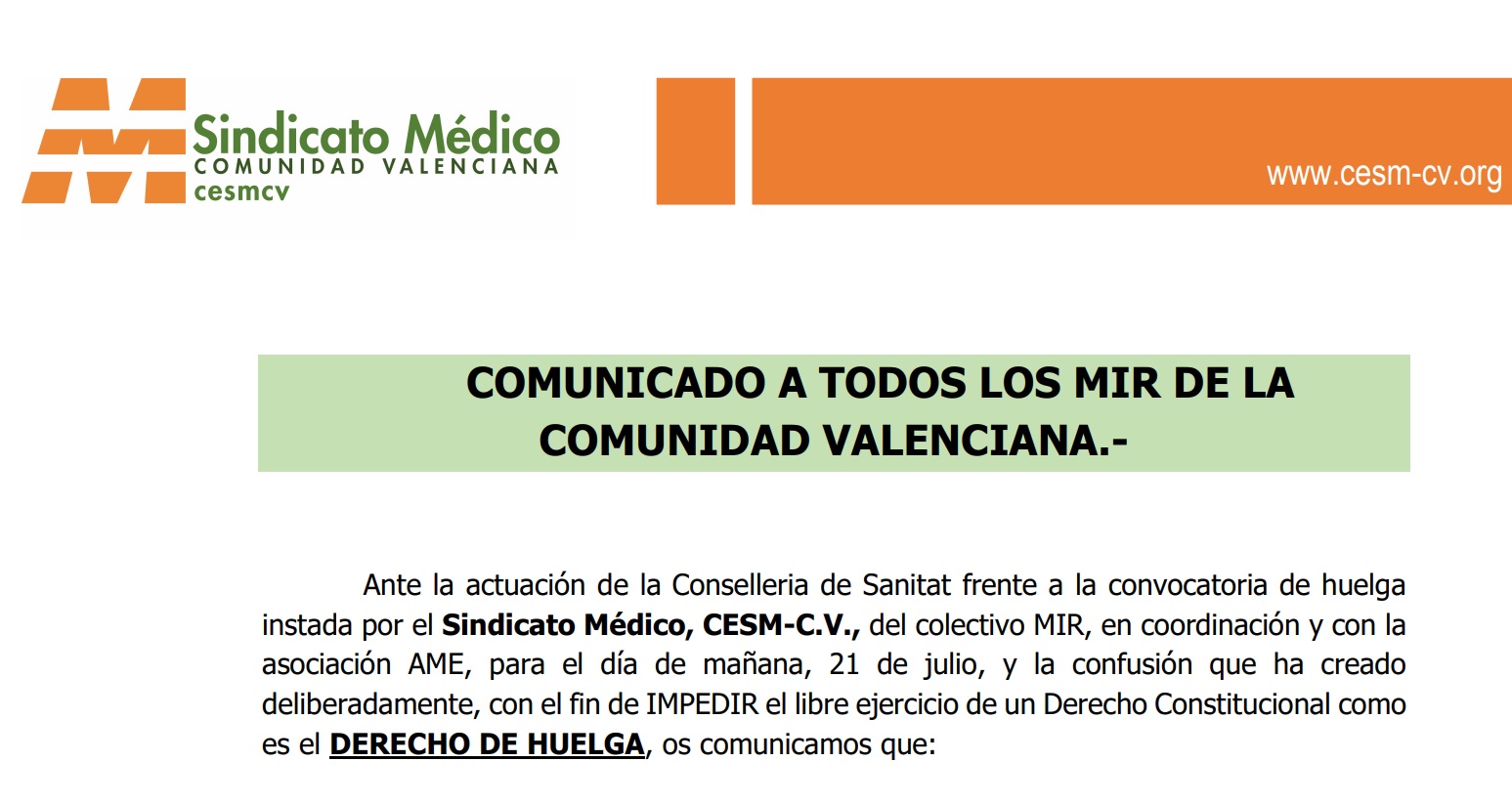 Ante la actuación de la Conselleria de Sanitat frente a la convocatoria de huelga instada por el Sindicato Médico, CESM-C.V, del colectivo MIR, en coordinación y con la asociación AME, para el día de mañana, 21 de julio, y la confusión que ha creado deliberadamente, con el fin de IMPEDIR el libre ejercicio de un Derecho Constitucional como es el DERECHO DE HUELGA, os comunicamos que: