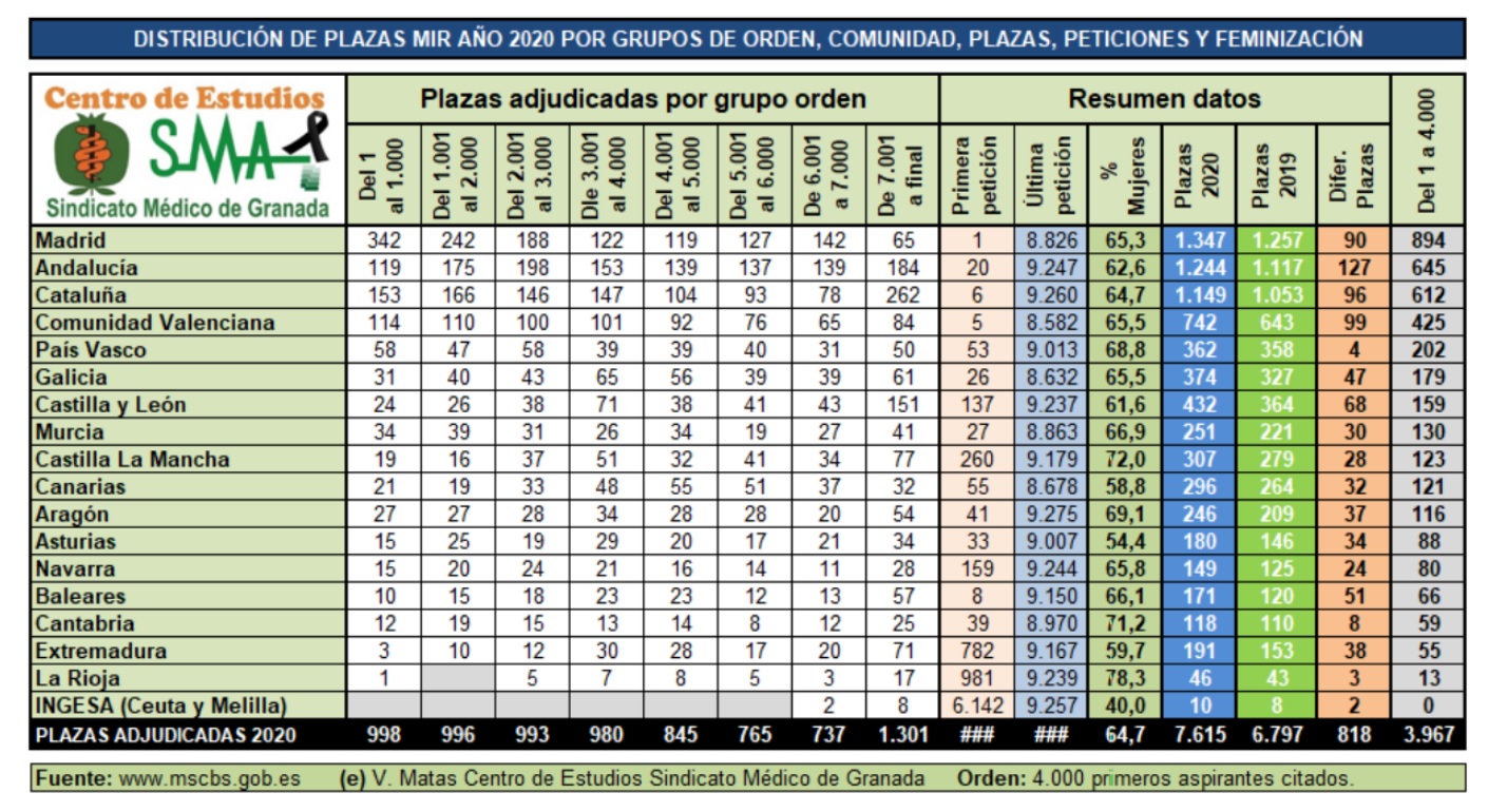 Dentro de los 4.000 primeros aspirantes, Madrid es la Comunidad con el mayor número de plazas elegidas, seguida de Andalucía, Cataluña y Comunidad Valenciana. Este año ha pasado Andalucía al segundo puesto que venía ocupando Cataluña en la convocatoria anterior, del año 2018, la del año 2017, la del año 2016, la del año 2014 y la del año 2013.