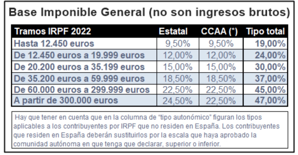 En el caso de elegir el importe completo en pago único, recibiría unos 12.000 euros brutos por año completo, pero en general no es aconsejable, pues cobrando el 4% mes a mes con una supervivencia como pensionista de diez años el importe sería de 15.787,4 con el importe actual y con veinte años de supervivencia llegaría hasta los 31.754,8 euros con el importe actual, evidentemente habría que ir aumentado el importe que cada año se revaloricen las pensiones. Además, los 12.000 euros por año completo en pago único, incrementan la base imponible del año de la jubilación que, con parte en activo y el resto la pensión podría estar en el tramo del 37% o incluso del 45% si la parte en activo es importante, como podemos ver en la tabla siguiente.