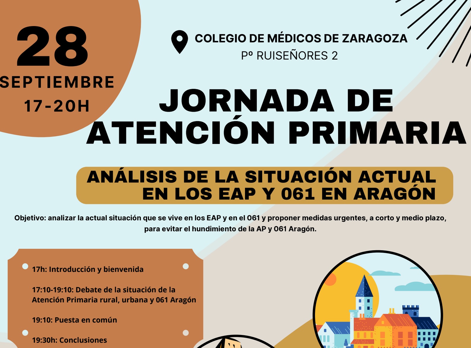 Las vocalías de Médicos de Atención Primaria rurales y urbanos de los tres Colegios profesionales y los Sindicatos Médicos de Atención Primaria de Aragón celebran el próximo día 28 en el Colegio de Médicos de Zaragoza la Jornada de Atención Primaria “Análisis de la situación en los Equipos de Atención Primaria y 061 en Aragón” para abordar las circunstancias de las distintas áreas de trabajo, ya que tienen características diferentes, aunque todos comparten el principal problema: “la falta de recursos humanos”.