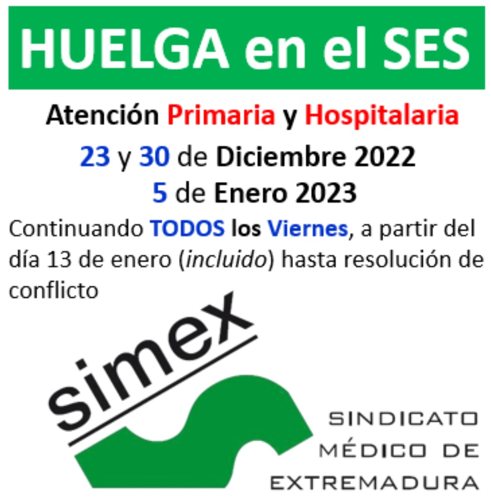 El Sindicato Médico de Extremadura (SIMEX) ha anunciado que convoca huelga de médicos tanto de Atención Primaria como de hospitalaria para los próximos días 23 y 30 de diciembre y 5 de enero, así como para todos los viernes a partir del próximo 13 de enero hasta la resolución del conflicto.