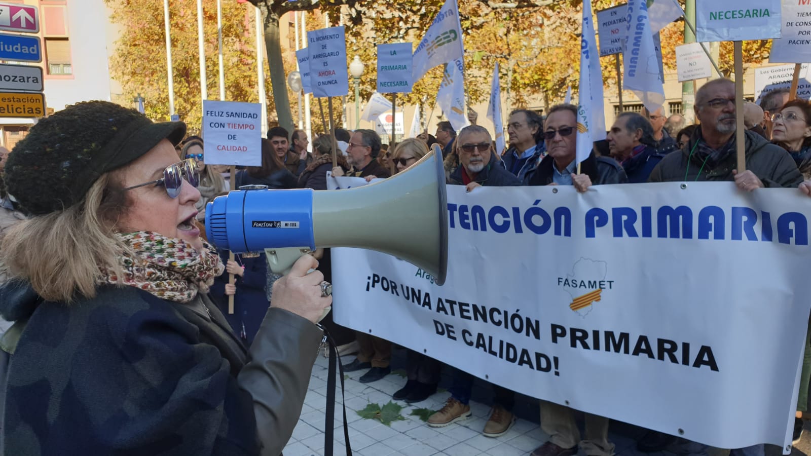 Ante el Gobierno de Aragón, la manifestación ha recordado sus demandas: un presupuesto del 25% destinado a la Atención Primaria, una gerencia específica de su ámbito laboral, una agenda acorde con el tiempo de trabajo, poder conciliar la vida familiar, mejoras organizativas y de recursos humanos en los centros de salud, tener en cuenta las especiales características de la zona rural y un trato adecuado de tutores y residentes MIR.