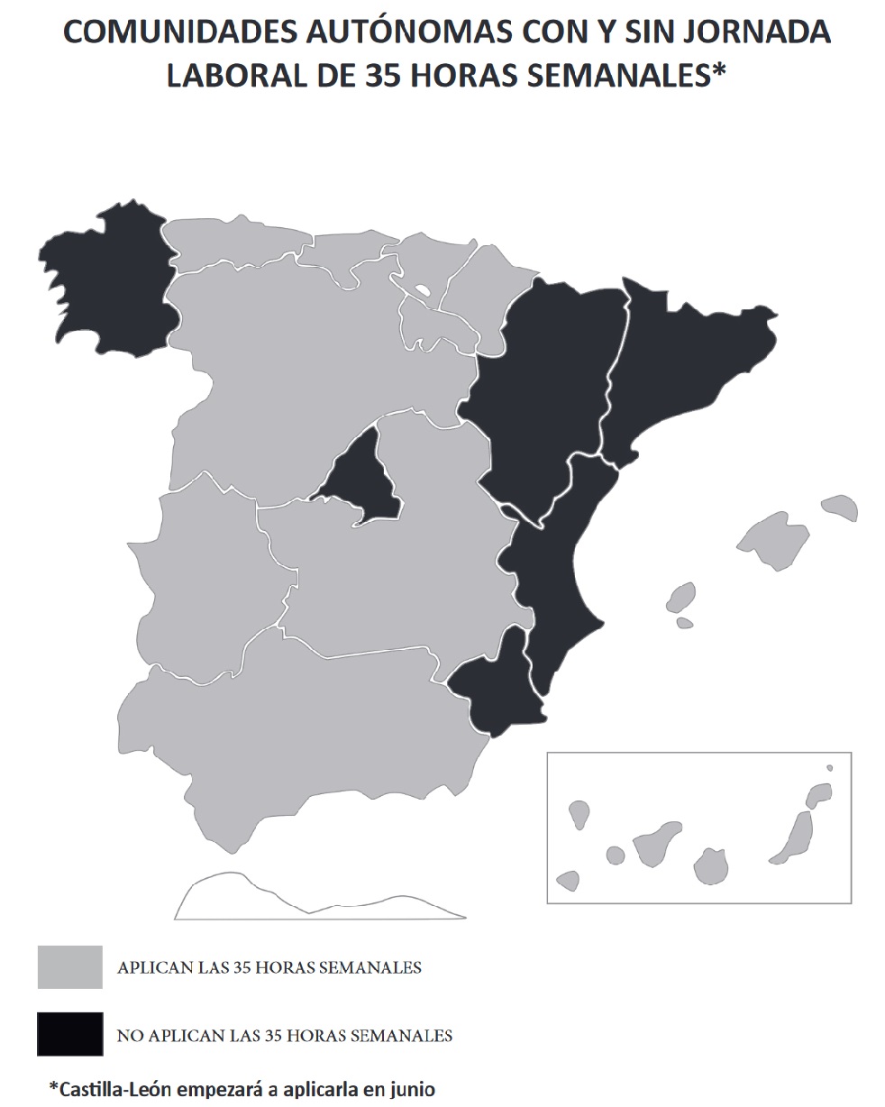 Andalucía, Extremadura, Castilla–La Mancha, Navarra, Euskadi, Cantabria, Asturias, La Rioja, Canarias y Baleares han recuperado o implantado por primera vez la jornada de 35 horas y Castilla–León lo hará el próximo mes de junio, por lo que resulta intolerable que Galicia continúe con las 37,5, desatendiendo una demanda que desde esta Central Sindical se ha reclamado reiteradamente en los últimos años.