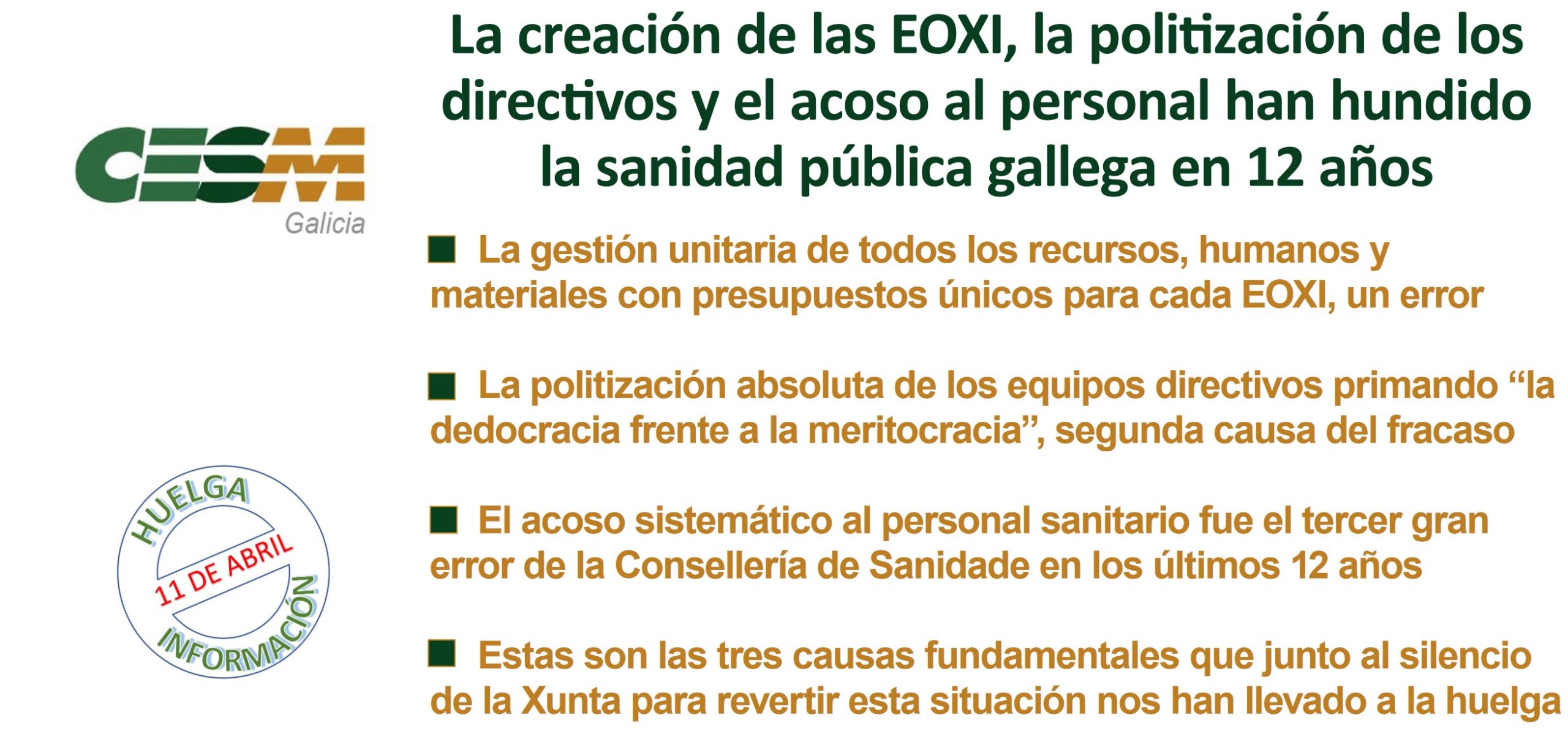 La Delegación de la Confederación Estatal de Sindicatos Médicos en Galicia (CESM) afirma que en los últimos 12 años las circunstancias, las decisiones y los hechos que han llevado a las profunda crisis que sufre hoy la sanidad pública gallega son muy diversos y variados, y pone el acento en 3 de ellos como son la creación de las 7 Estructuras Organizativas de Xestión Integrada (EOXI) en 2011; la figura de un único directivo de corte político con capacidad absoluta en todo el Área Sanitaria, y una nefasta gestión de los recursos humanos basada en el acoso sistemático al personal sanitario.