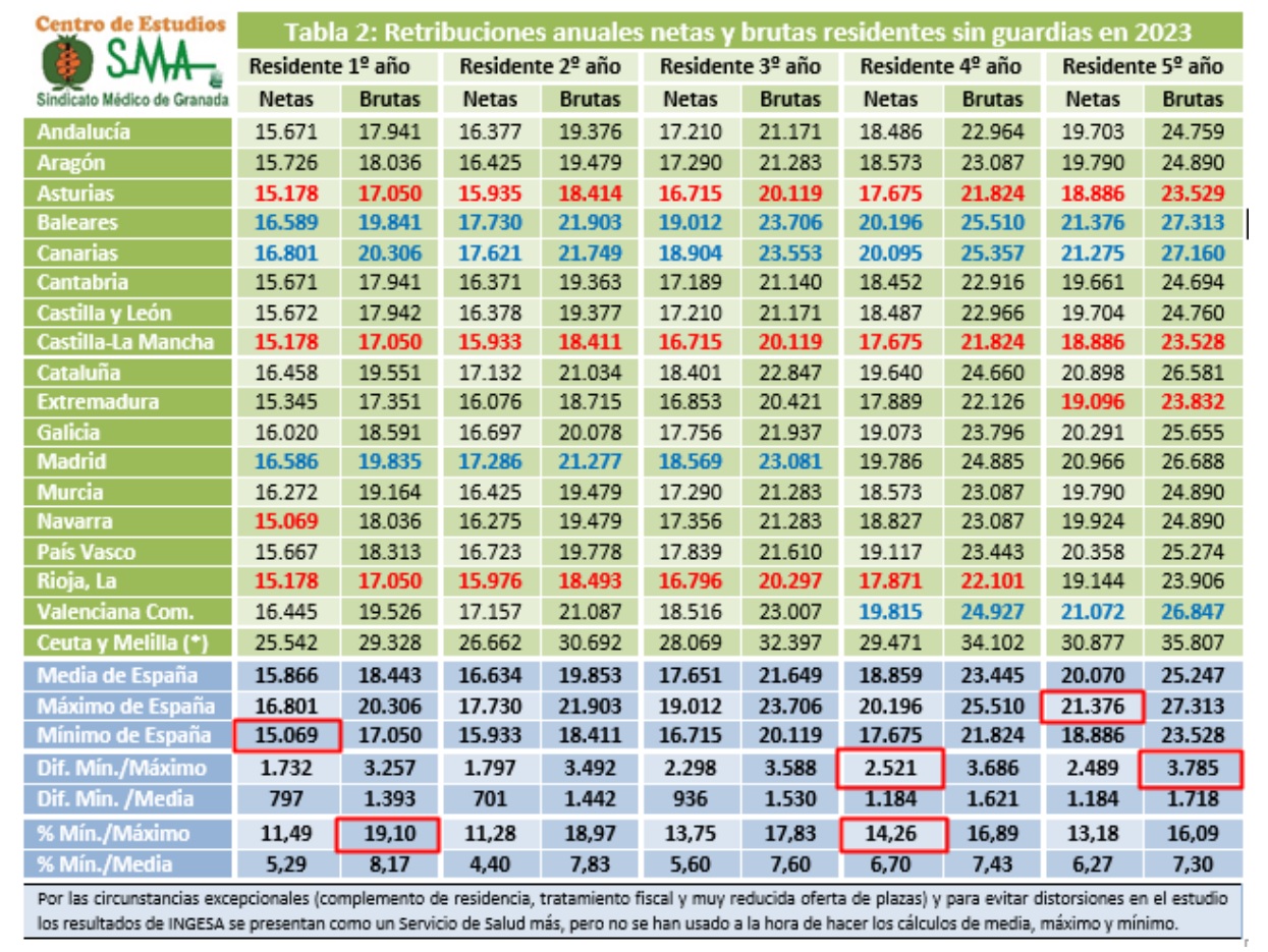 Las diferencias mensuales brutas (sin guardias) entre máximos y mínimos van desde los 239 euros/mes (el 18,69%) para los residentes de primer año hasta los 272 euros brutos/año (el 15,44%) para los de quinto año. Las diferencias en el neto llegan hasta el 18,88% en el residente de primer año. Las diferencias entre el mínimo y la media llegan al 7,60% y superan el 3,77% en todos los casos.