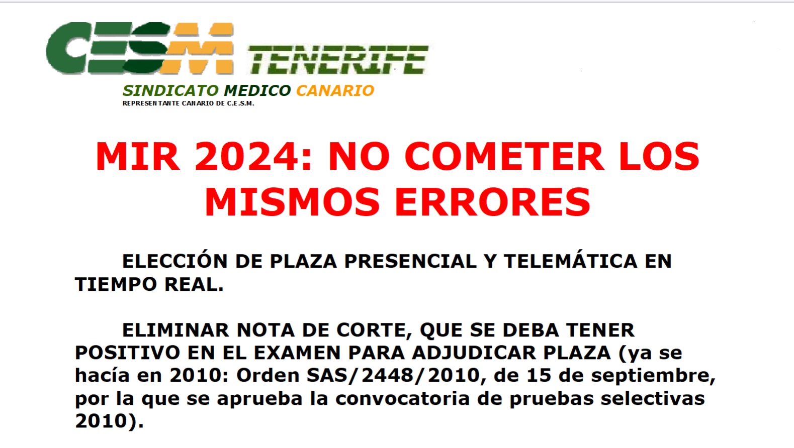 El Sindicato Médico CESM Canarias ha querido resaltar cuáles son los principales errores que afectan al actual sistema de Formación Sanitaria Especializada en un contexto de próximas elecciones generales y ante la próxima convocatoria de la oferta MIR prevista para 2024.