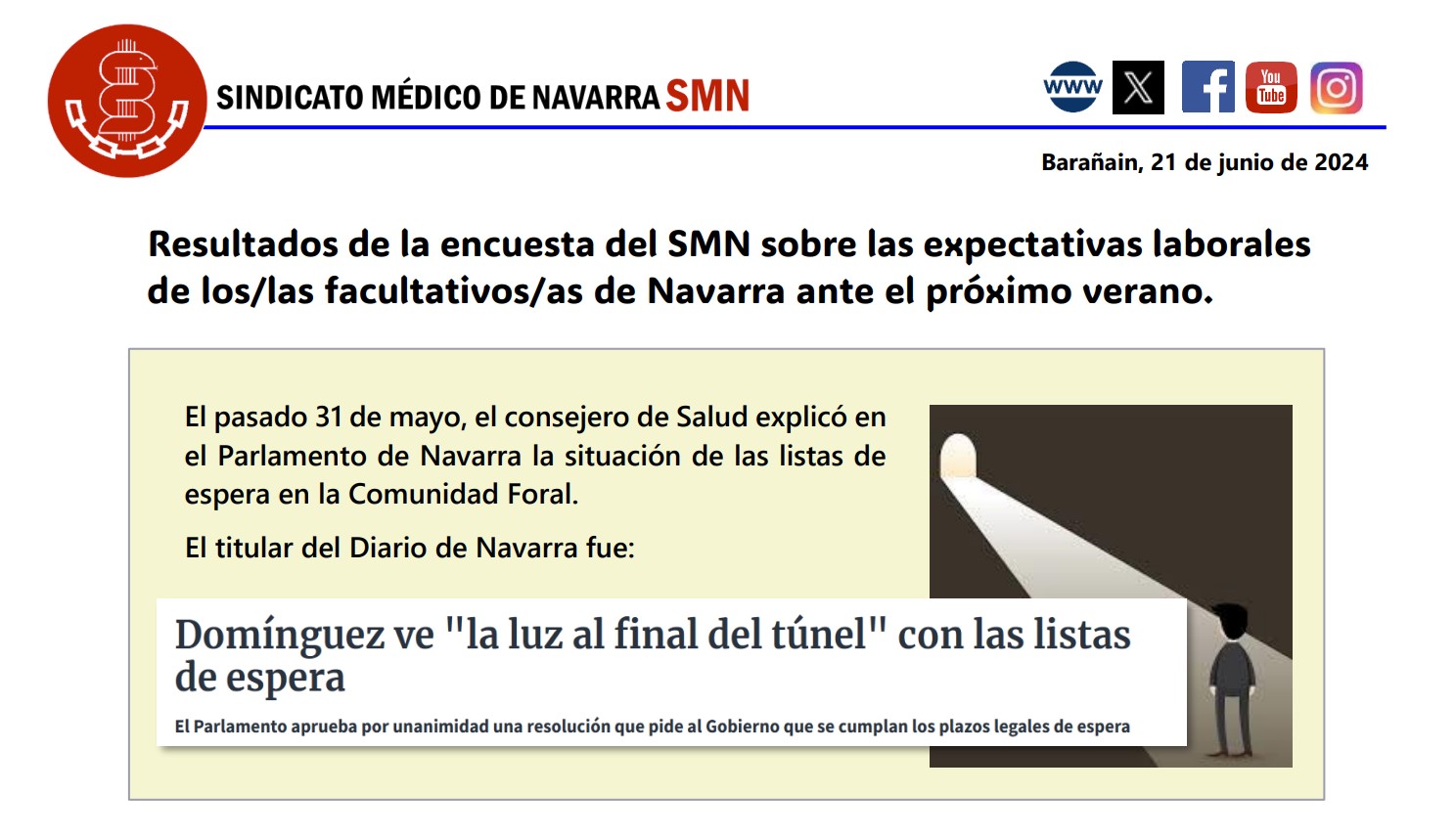 «Desde el Sindicato Médico de Navarra somos conscientes de que este verano se plantea especialmente complicado por el déficit cada vez mayor de médicos y por la enorme sobrecarga que sufrirán los que van a atender a la población. Para constatar la gravedad de la situación actual se ha consultado a los afiliados sobre la situación real que van a vivir este verano.