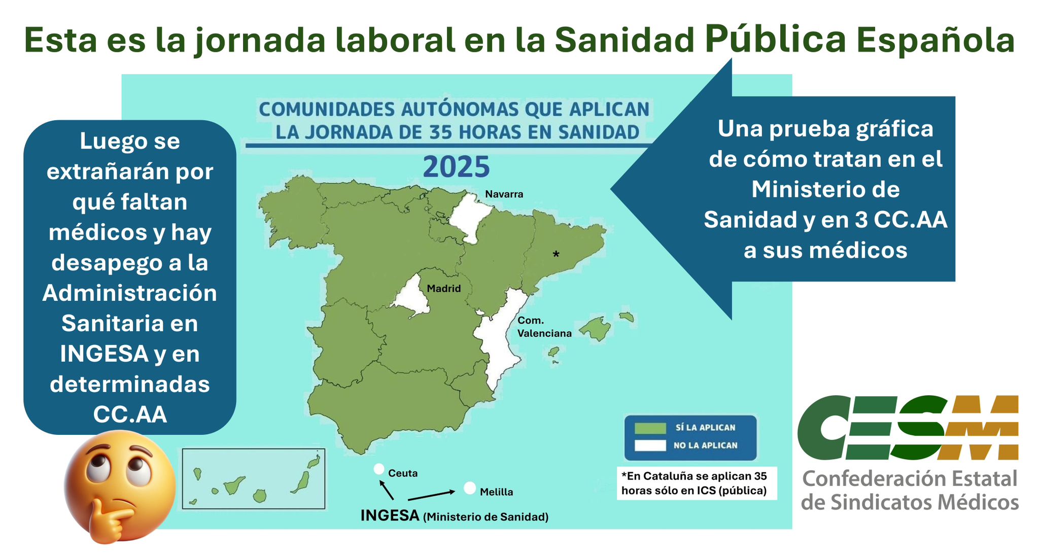 La Confederación Estatal de Sindicatos Médicos (CESM) ha recopilado los datos sobre cuál es la situación de cada comunidad autónoma en lo que a jornada laboral se refiere, puesto que en su momento su subió a 37 o 37,5 horas pero progresivamente y cada una en un momento determinado ha ido volviendo a las 35 horas demandadas.