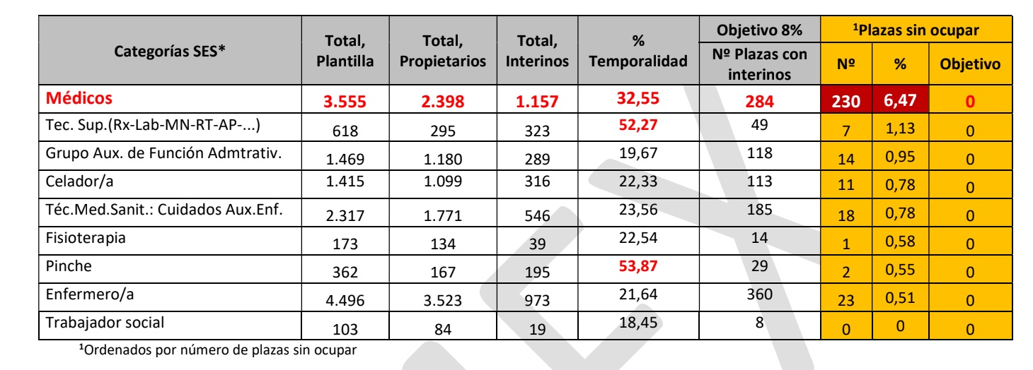 Según el sindicato, los médicos constituyen el segundo grupo profesional sanitario más numeroso en el SES, pese a lo cual, cuentan con una tasa de temporalidad mayor que la del primero. Sin embargo, el dato más alarmante es el número excesivo de plazas vacías, aquellas presupuestadas y no ocupadas ni por propietario ni por interino. En concreto, una tasa del 6,47% de plazas sin ocupar no se puede mantener, ni por los médicos -que asumen la ausencia de compañeros- ni por la población.