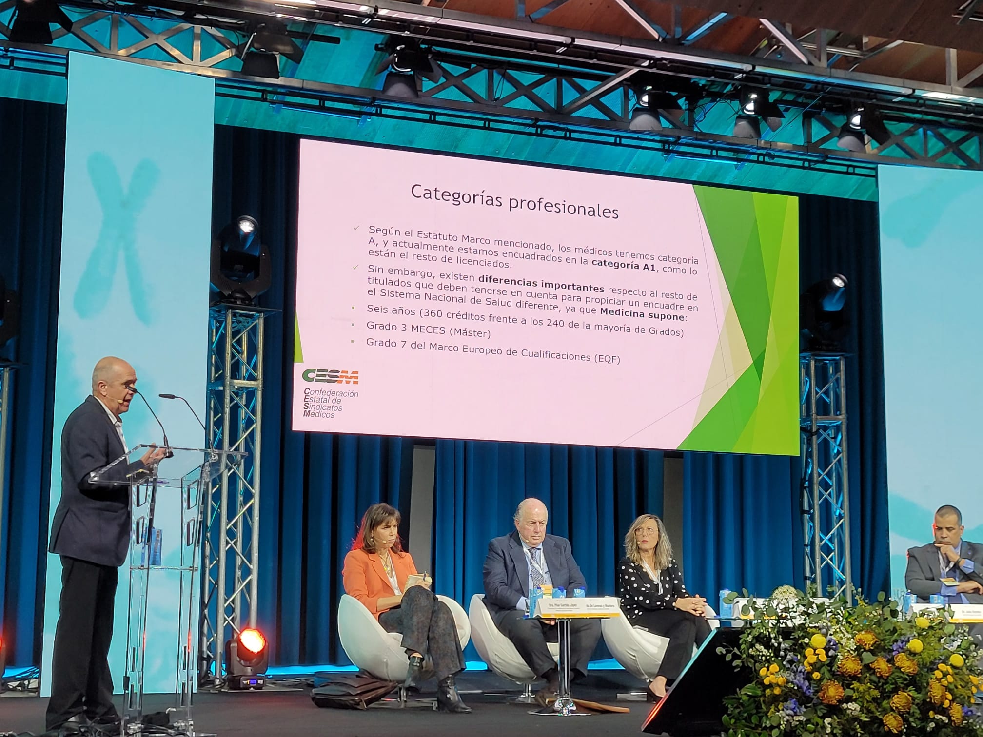 El discurso del secretario general ha incluido la defensa de los otros colectivos sanitarios «con los que trabajamos muy a gusto» y sus competencias concretas señalando que «no nos oponemos a que reclamen lo que es suyo y se les encuadre en la categoría A1 si cumplen los requisitos. Pero, en ese caso, por formación, por exigencia, por liderazgo, por finalidad y por responsabilidad nosotros debemos ser otra categoría que sea A1 +, A1 plus o como la quieran llamar; no podemos estar en la misma categoría sino que debemos diferenciarnos y arrastrar allí las competencias que nos corresponden, como el resto tiene sus competencias propias que difieren de las que tenemos nosotros», argumentaba.