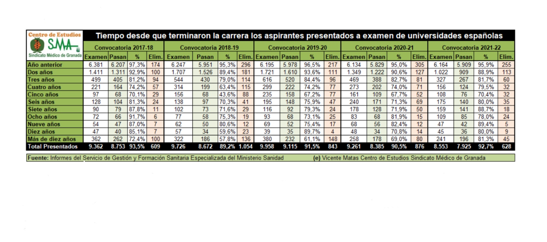 El Centro de Estudios del Sindicato Médico de Granada ha elaborado un informe sobre los datos de egresados de las universidades españolas que se han presentado al examen MIR desde la convocatoria 2017-2018, analizando si han superado el corte teniendo en cuenta dos variables: el tiempo que hace que terminaron sus estudios de medicina y la edad por grupos. También vamos a comparar los egresados el año anterior con los que se presentan al MIR el primer año y por último estudiaremos de los admitidos al MIR, los que obtienen plaza y los que quedan sin plaza tanto de Universidades Españolas, como españoles y el total de admitidos.