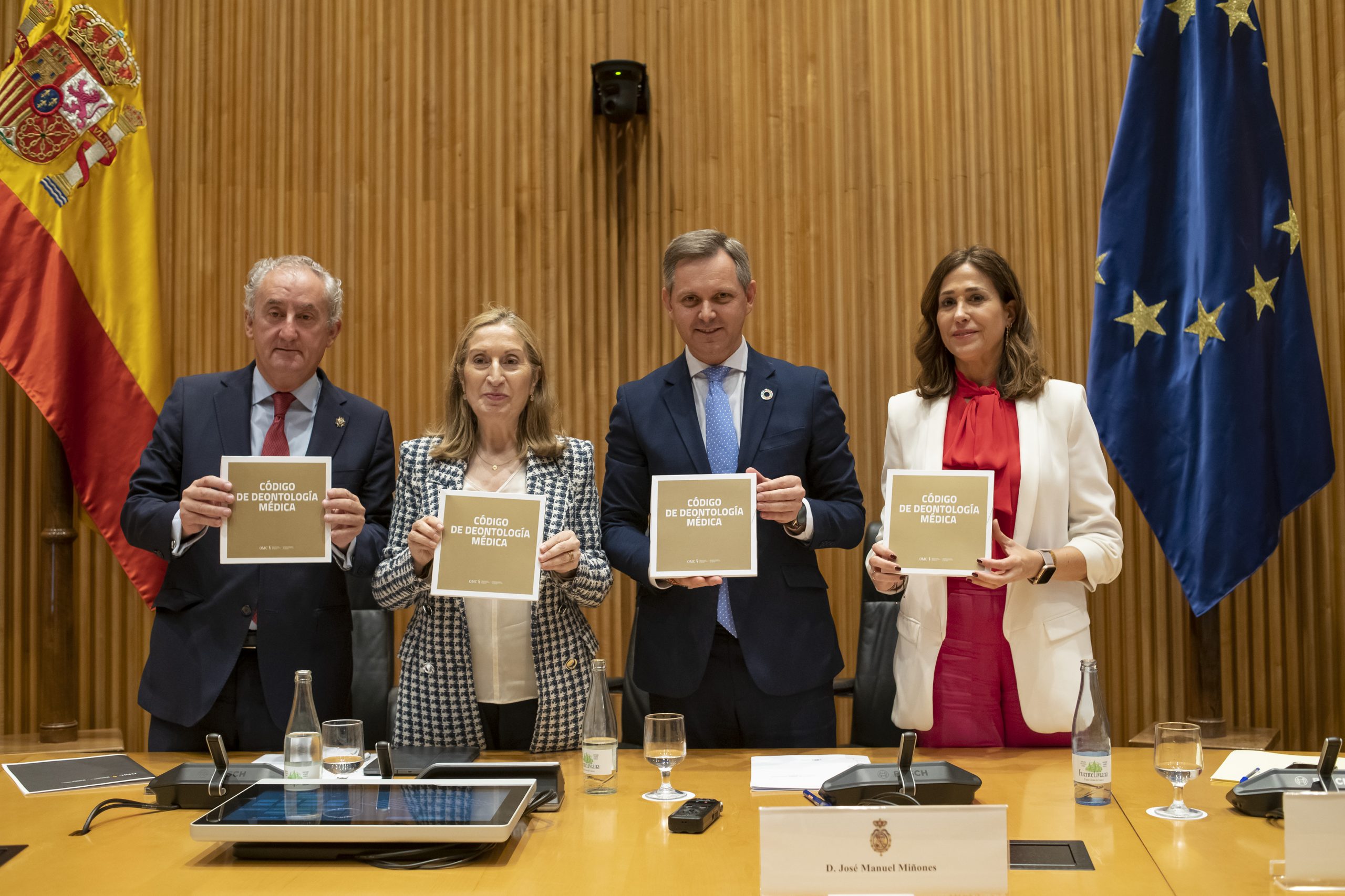 En la tarde de este jueves el salón Ernest Lluch del Congreso de los Diputados, sede de la soberanía nacional, ha acogido la presentación del nuevo Código de Deontología Médica aprobado por la Asamblea General del Consejo General de Colegios Oficiales de Médicos de España (CGCOM) en un acto que ha contado con la participación del nuevo ministro de Sanidad, José Manuel Miñones; la vicepresidenta segunda de la cámara baja, Ana Pastor; la presidenta de la Comisión de Sanidad de esa misma cámara, Rosa Romero; y el presidente del Consejo General de Médicos, Tomás Cobo. Al acto han acudido también el presidente y el secretario general de la Confederación Estatal de Sindicatos Médicos, Tomás Toranzo y Gabriel del Pozo, respectivamente.