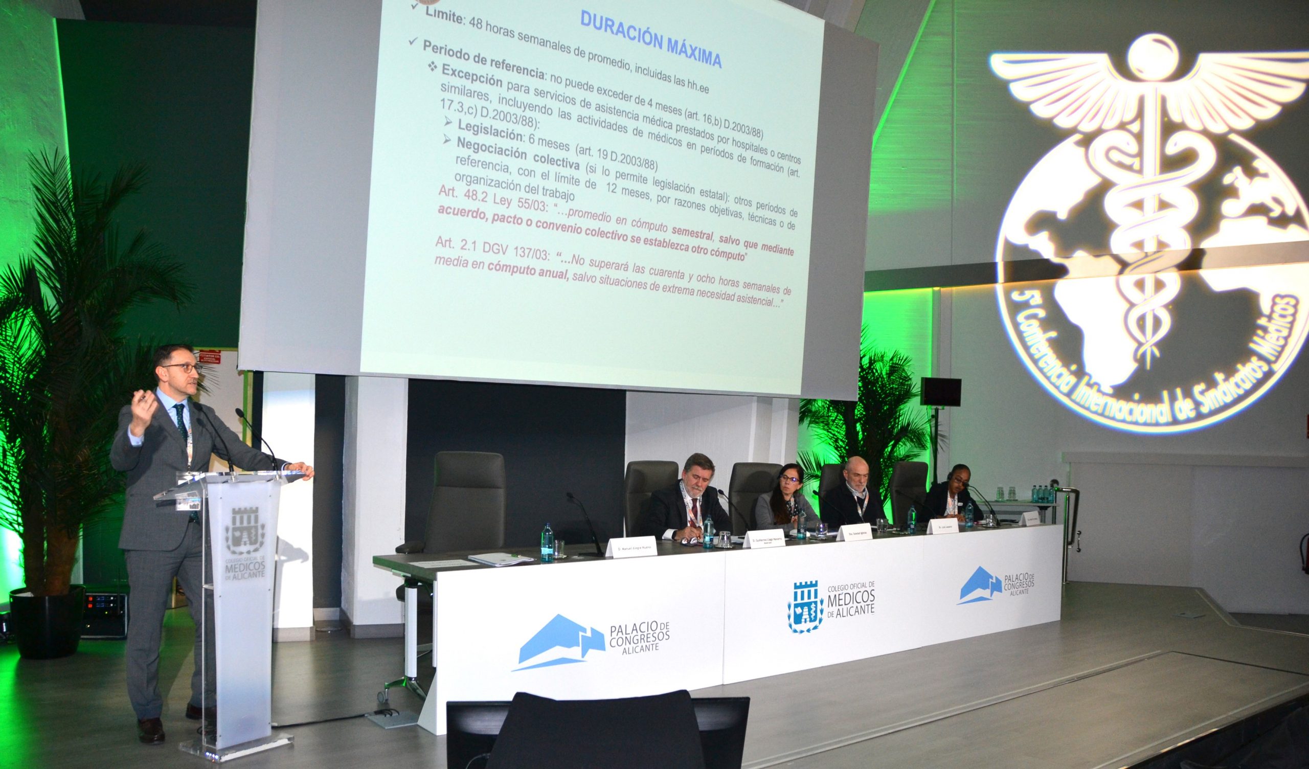 La tercera mesa de la V Conferencia Internacional de Sindicatos Médicos celebrada los días 25 y 26 de enero en Alicante organizada por la Confederación Estatal de Sindicatos Médicos (CESM) con la colaboración de CESM CV y el Colegio Oficial de Médicos de Alicante (COMA) abordó las condiciones de trabajo, salarios, jornada laboral, guardias médicas y el derecho comparado. Moderada por Guillermo Llago, secretario técnico jurídico del Sindicato Médico CESM CV, contó con la participación de Manuel Alegre, magistrado de la Sala de lo Social del Tribunal Superior de Justicia de la Comunidad Valenciana; Soledad Iglesias y Luis Lazarov, del Sindicato Médico del Uruguay y Mindi Fitz-Henley, presidenta de la Medical Doctors Association de Jamaica.