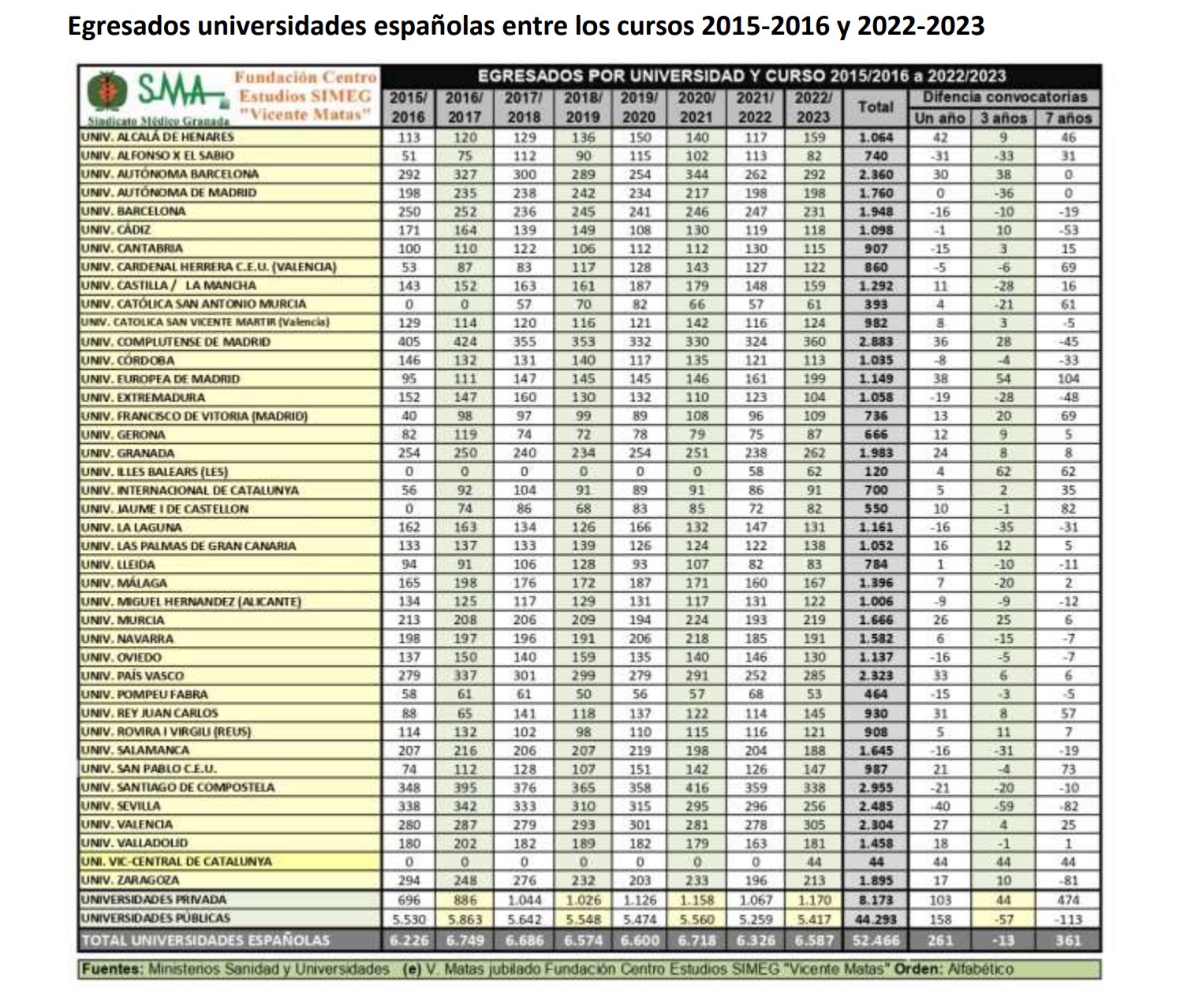 El Centro de Estudios del Sindicato Médico de Granada ha elaborado un informe en que estudian, entre las convocatorias 2015-2016 a 2023-2024, los egresados, nuevos ingresos de nuestras universidades y los resultados en el MIR: admitidos, presentados al examen, superan nota de corte y si han obtenido o no plaza. También aparecen en las tablas las diferencias con el año pasado, tres años antes y siete años antes.