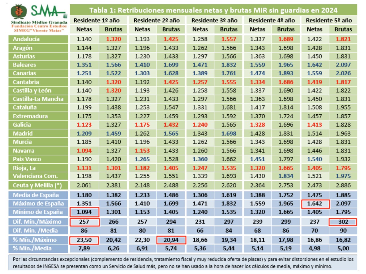 Las diferencias brutas entre máximos y mínimos van desde los 266 euros al mes (el 20,42%) para los residentes de primer año hasta los 302 euros brutos/año (el 16,82%) para los de quinto año. Las diferencias en el neto llegan hasta el 23,50% en el residente de primer año. Las diferencias entre el mínimo y la media llegan al 7,89% y superan el 4,98% en todos los casos.