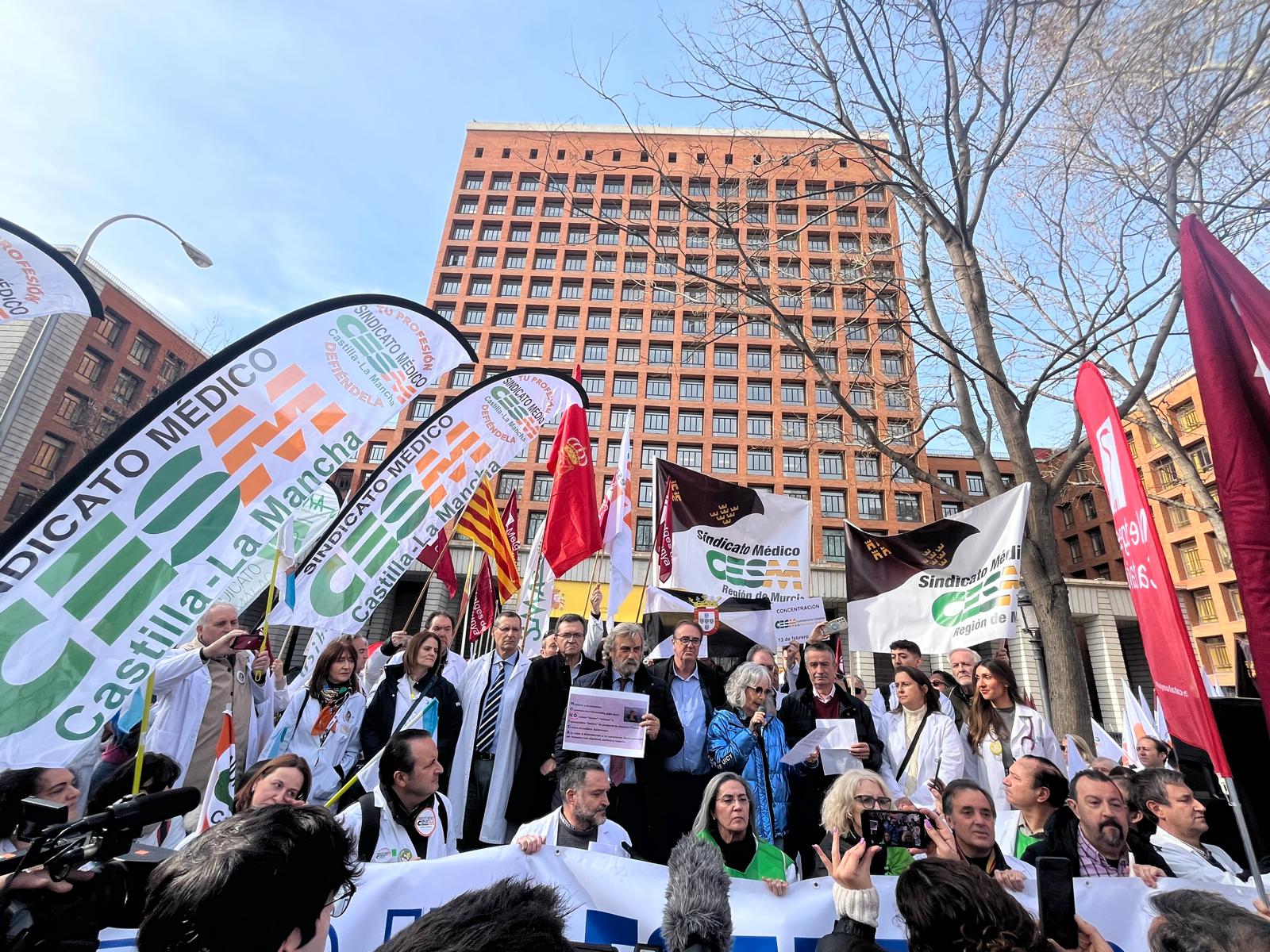 La Confederación Española de Sindicatos Médicos (CESM) ha formado parte este jueves de una multitudinaria concentración frente al Ministerio de Sanidad a la que han acudido todos los sindicatos profesionales del territorio nacional y organizaciones representativas de la profesión médica para mostrar el rechazo unánime que ha generado el borrador de Estatuto Marco que ha difundido el ministerio.